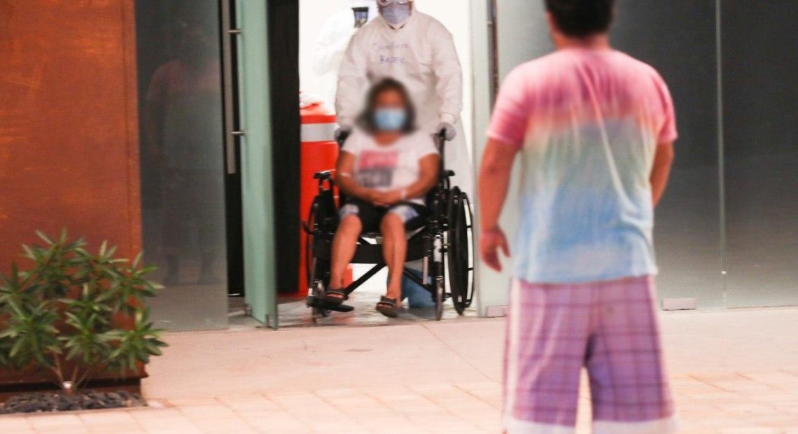 En silla de ruedas y apoyada por personal de salud, M.T.P. salió del edificio para ser recibida por su esposo, Luis B.B., quien comentó que la mujer atravesó días muy difíciles desde que se enteró que tenía Coronavirus, situación que causó angustia y preocupación para él y el resto de sus familiares.