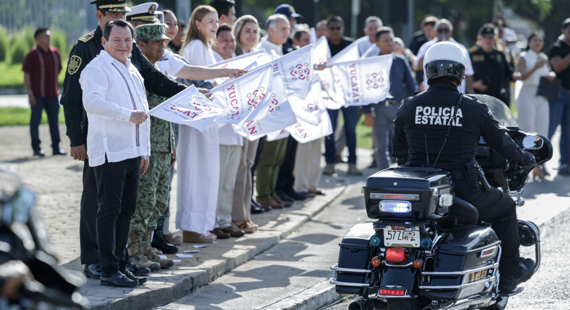 Desde el asta bandera monumental, al norte de Mérida, el Gobernador Joaquín Díaz Mena dio el banderazo de salida al contingente conformado por elementos de la Secretaría de Seguridad Pública (SSP), policías municipales, Ejército Mexicano, Secretaría de Marina, Guardia Nacional, las Fiscalías General de la República y del Estado, así como personal de Protección Civil.