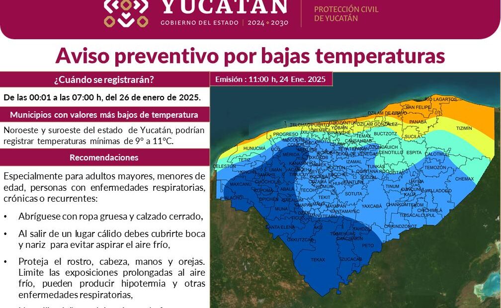 El Gobierno del Estado, a través de la Coordinación Estatal de Protección Civil (Procivy), informa que, debido a la masa de aire ártico que impulsó al Frente Frío No. 24, se espera que en la madrugada de este domingo 26 de enero se registre un descenso en las temperaturas en todo el Estado de Yucatán, por lo que se recomienda a la población tomar las debidas precauciones.