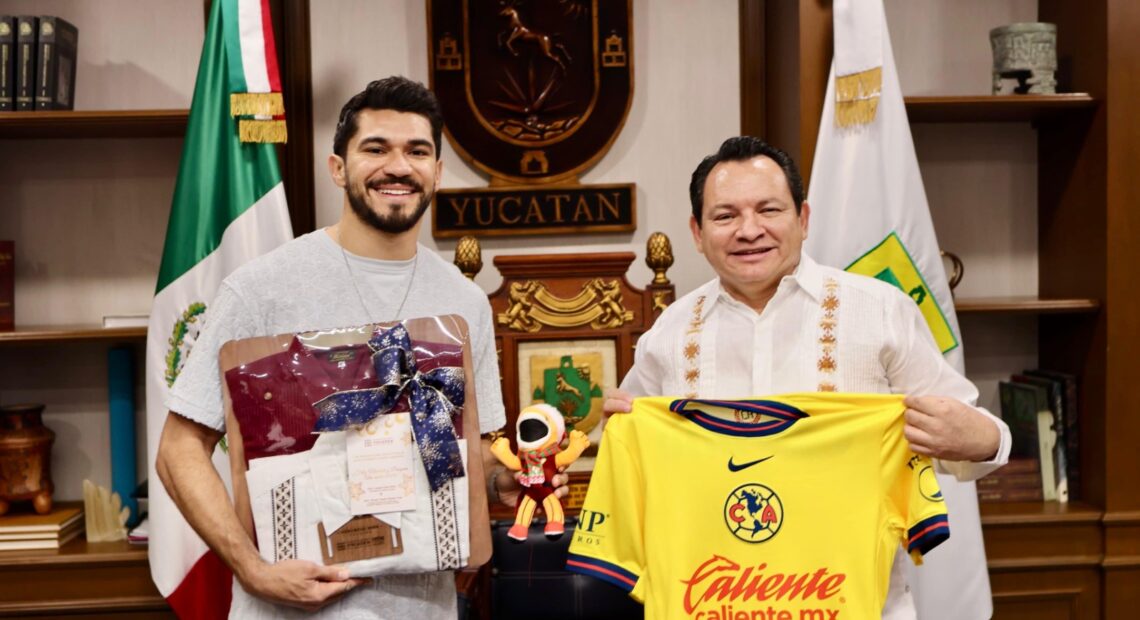 El mandatario estatal recibió al delantero americanista en su despacho, en Palacio de Gobierno, para platicar sobre su gran desempeño en la más reciente temporada con el equipo azulcrema, así como sobre el gran modelo a seguir en el que se ha convertido para las yucatecas y los yucatecos de todas las edades.