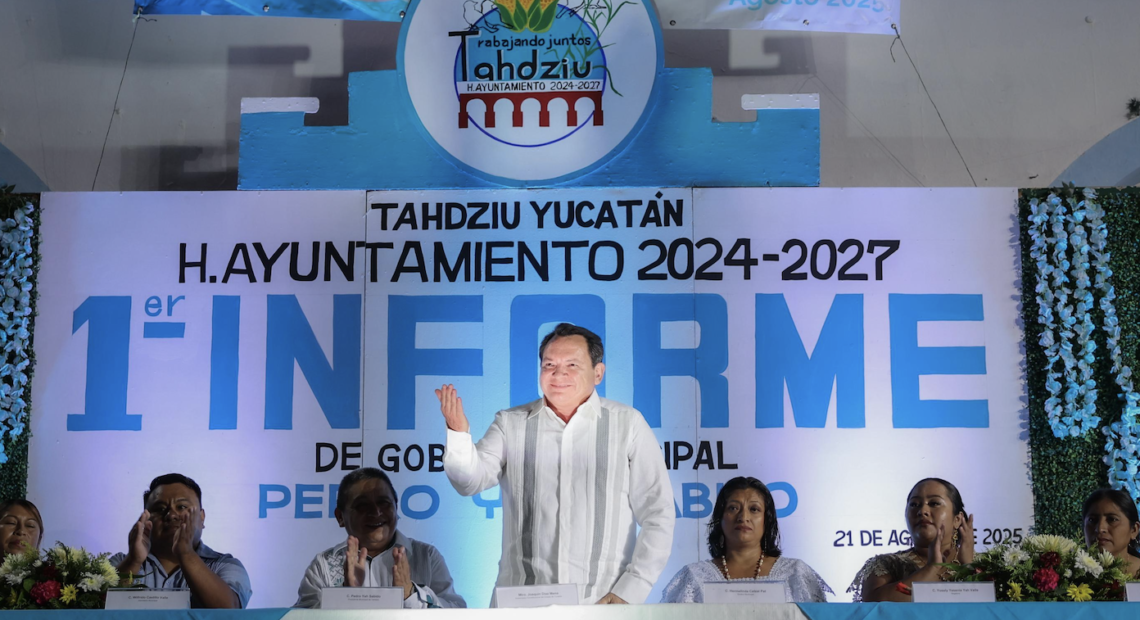 Más tarde, en Tahdziú, el Gobernador acompañó al alcalde Pedro Yah Sabido en la presentación de su informe, donde anunció la intervención de calles, la mejora de la red de agua potable mediante dos pozos y la construcción de un domo en el Telebachillerato de la comisaría de Timul.