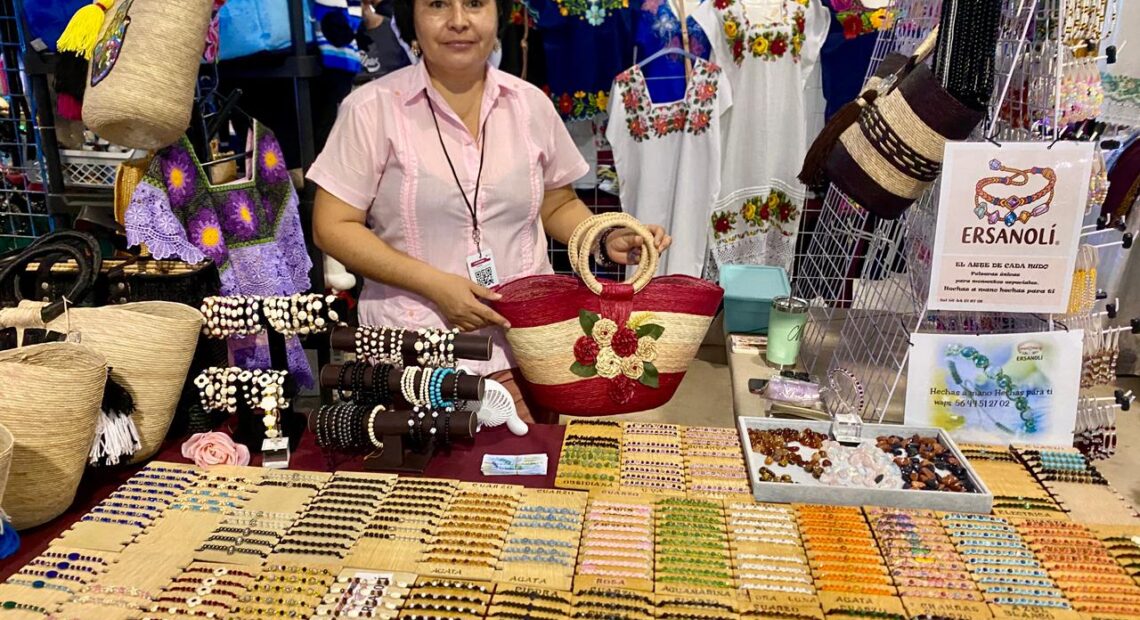 Desde Kanasín, Erzanoli ofrece pulseras de gemas, bolsas, sombreros y piezas bordadas elaboradas por artesanos de Seyé. Su representante, María Santillán, agradece la oportunidad de participar por primera vez en la feria tras ser seleccionada en la convocatoria del IYEM.
