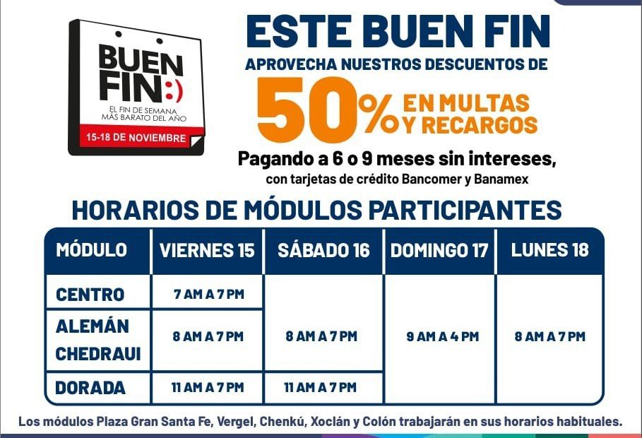 La Agencia de Administración Fiscal de Yucatán (AAFY) también se une a El Buen Fin y extenderá sus beneficios hasta el 30 de noviembre, brindando un descuento de 50 por ciento en multas y recargos derivados de impuestos locales, así como de faltas administrativas.