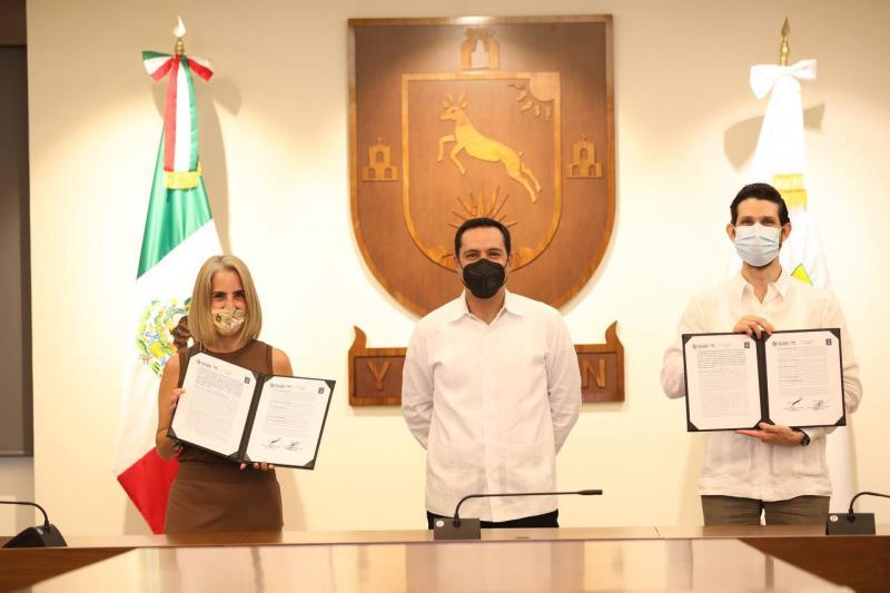 El Gobernador Mauricio Vila Dosal atestiguó la firma de un convenio de colaboración entre el director del Instituto Yucateco de Emprendedores (IYEM), Antonio González Blanco, y la directora General del referido organismo, Rocío Abud Mirabent, que derivará en acciones de capacitación en línea, asesorías grupales, networking y recompensas para motivar a los empresarios, todo dentro del mencionado esquema.