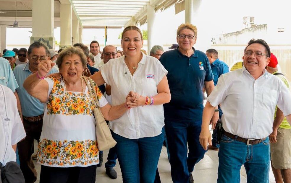 En la presentación estuvo acompañada de líderes de locatarios a quienes, en un recorrido por los mercados Lucas de Gálvez y San Benito, les expresó su apoyo para trabajar en equipo y darles un nuevo rostro a estos espacios que contarán con nuevas calles y andadores que conecten los portales, el parque Eulogio Rosado y sus alrededores.
