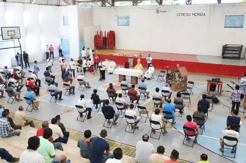 Mérida, Yucatán, 24 de diciembre de 2020.- Cumpliendo con todas las medidas sanitarias que marcan las autoridades, personas privadas de su libertad asistieron a la tradicional misa de Navidad en el auditorio del Centro de Reinserción Social (Cereso) de Mérida, que fue presidida por el arzobispo de Yucatán, Gustavo Rodríguez Vega y contó con la presencia de las autoridades penitenciarias, encabezadas por el director, Francisco Javier Brito Herrera.