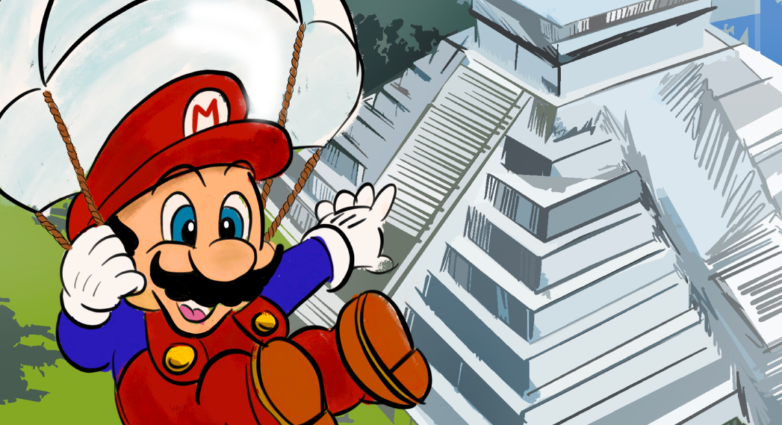 El primer ejemplar de la revista Club Nintendo, que se convertiría en la compra obligada al mes de muchísimos lectores por aquél lejano diciembre de 1991, muestra a un Mario descendiendo desde el cielo en paracaídas a la Ciudad de México.