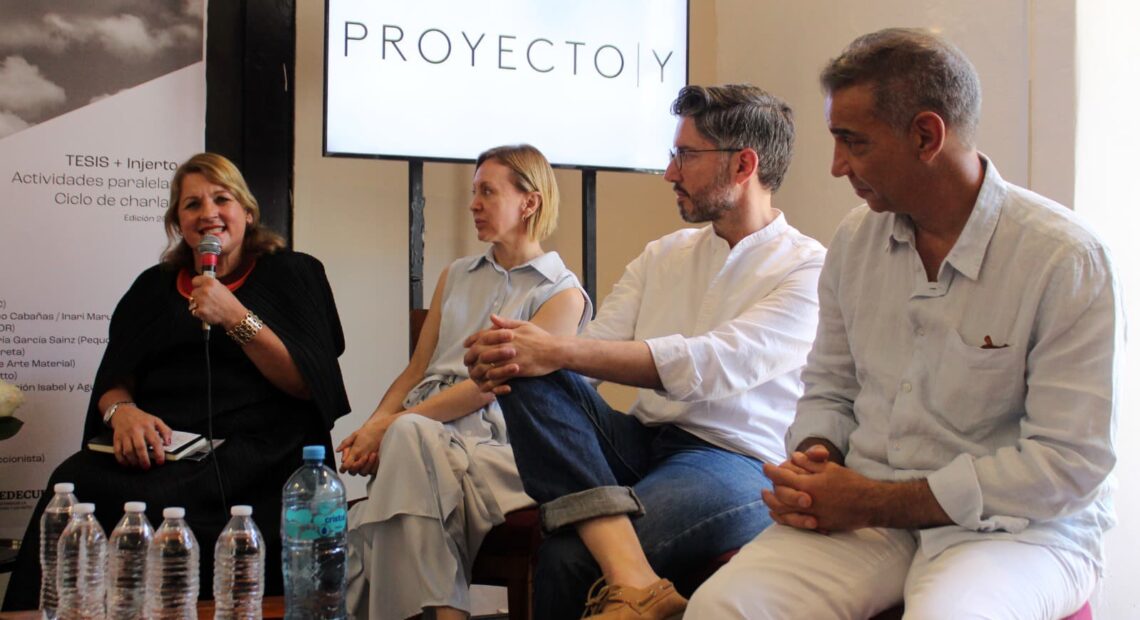 En las charlas de esta mañana de Tesis+Injerto en la Casa la Cultura del Mayab estuvieron presentes artistas y especialistas en curaduría, museografía y coleccionismo como Minerva Cuevas, Pedro Reyes, Abraham Cruzvillegas, Fritzia Irizar, Marco A. Castillo, Laura Orozco, de ESPAC; Eugenia Braniff, de FEMSA; Ekaterina Álvarez, del MUAC; Lorena Peña Brito, de Museo Cabañas/Inari Maru; Pamela Echeverría, de LABOR; Mauricio Galguera y María García Sainz, de PequodCo; Mario Torre, de Galería Secreta, Brett W. Schultz, de Feria de Arte Material; Raúl Zorrilla, de Kurimanzutto; Magnolia de la Garza, de Colección Isabel y Agustín Coppel, y Boris Hirmas, coleccionista.